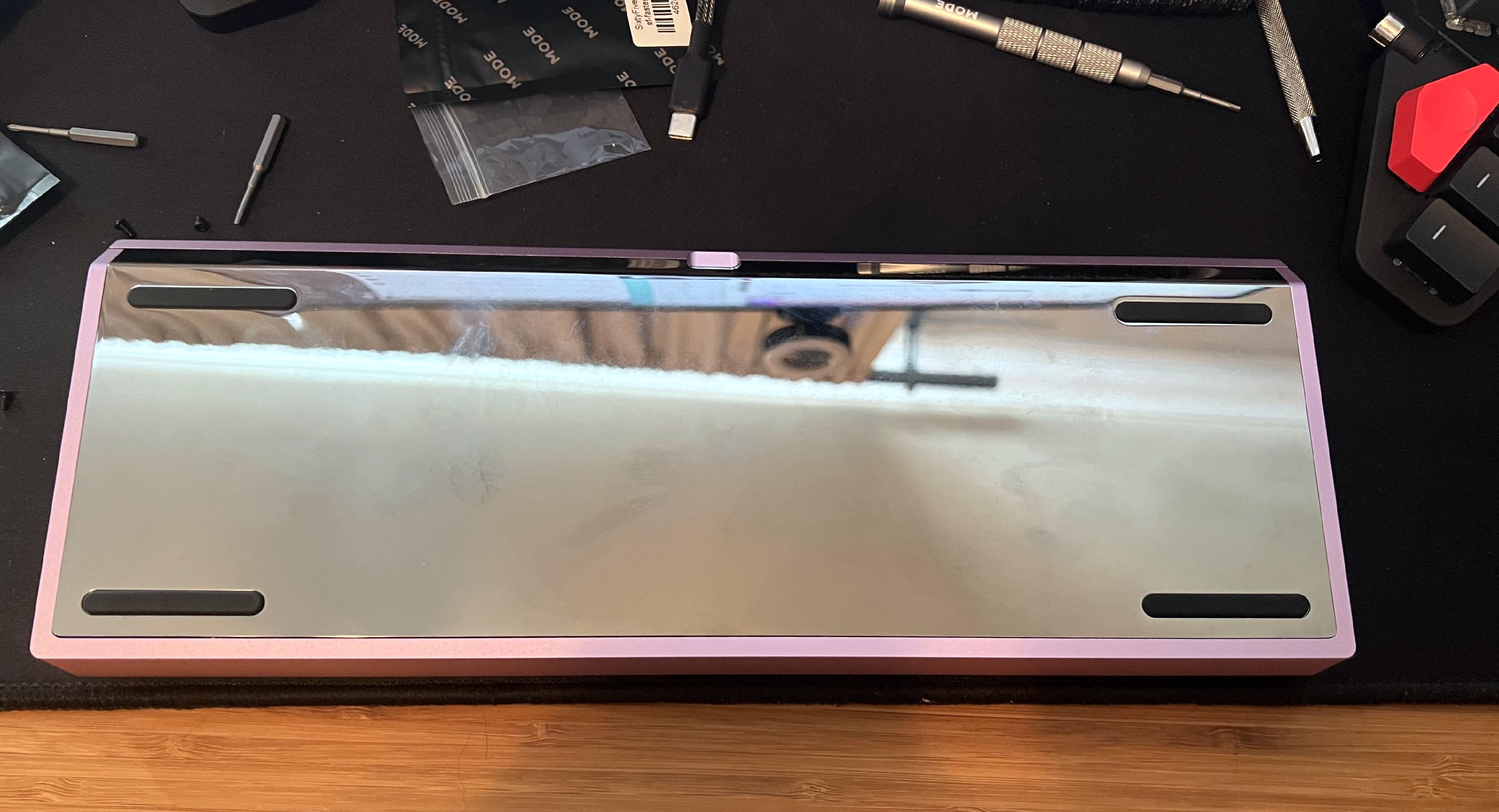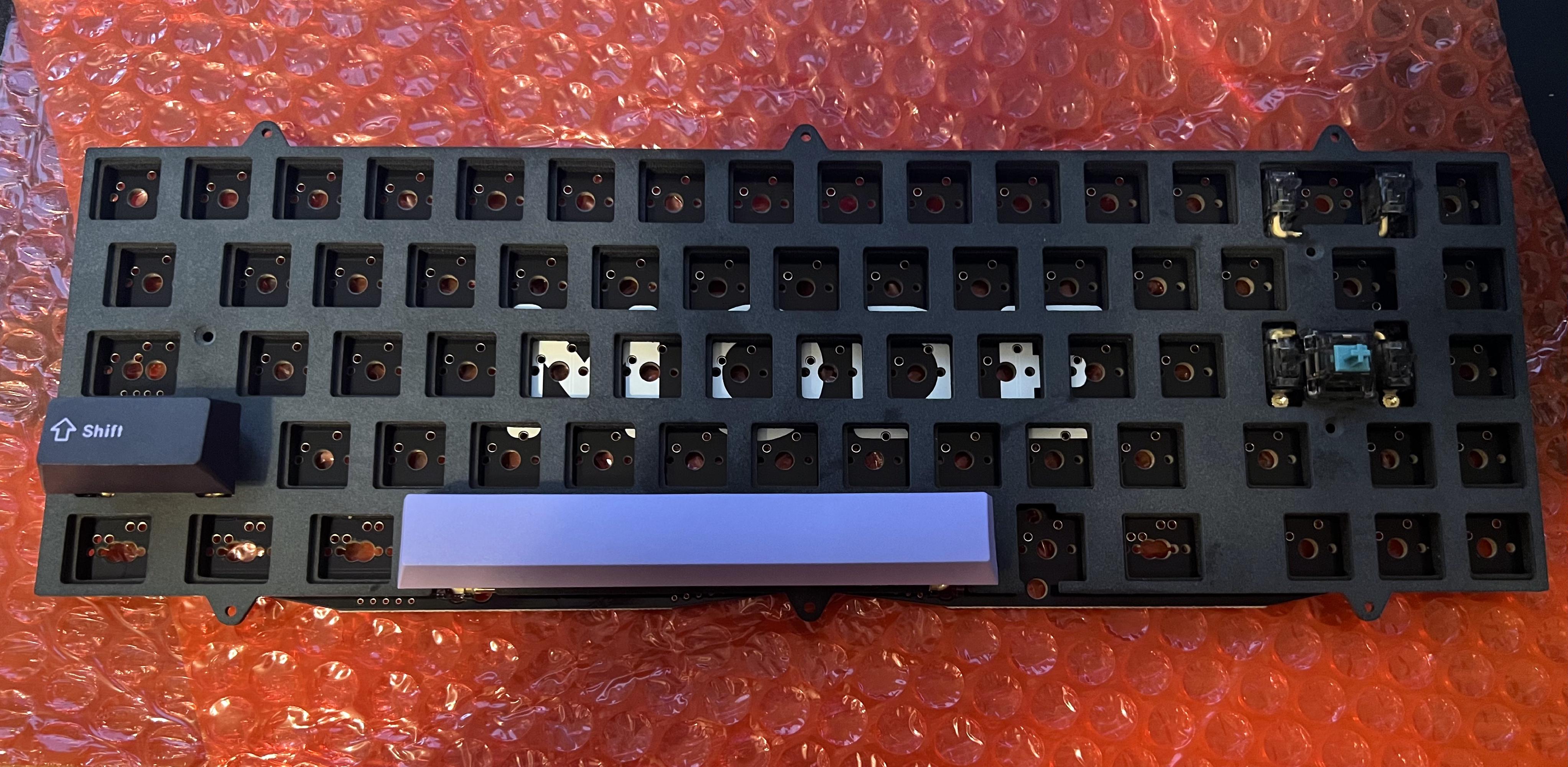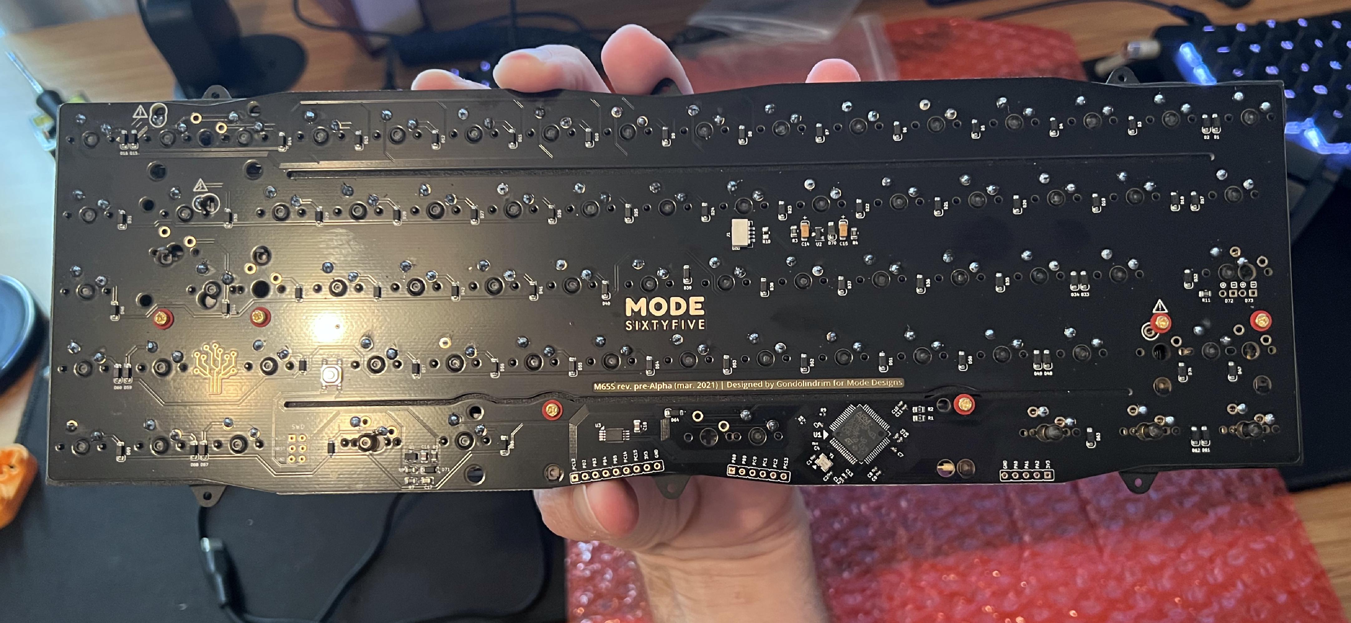 PCB top PCB bottom Testing space bar stabilizers with foam and plate PCB with switches Begin soldering switches to PCB PCB with num keys and bottom two rows PCB with num keys and bottom two rows PCB with full keys soldered Bottom view of all the soldered switches Mounted PCB in case upside down, for stack mount Top view of keyboard Second up close view Bottom mirror Top detailed view Mode65 Closeup of artisan space man keycap Final top view with coiled usb cable